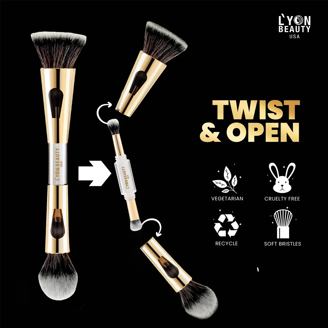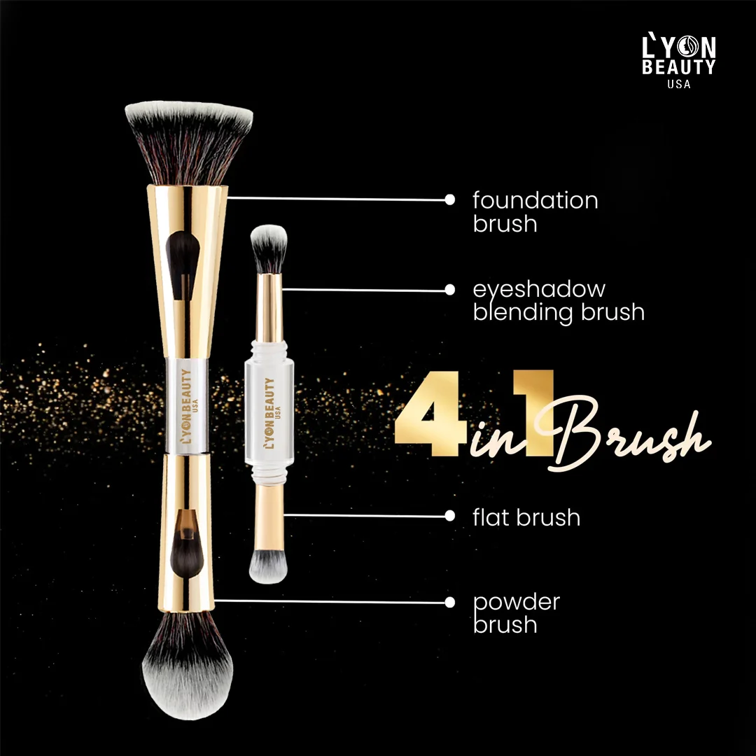 The 4 in 1 Travel Brush is a versatile, multi-functional makeup tool featuring a foundation brush, powder brush, eyeshadow blending brush, and flat brush—all in one compact design. Perfect for liquid, powder, or cream-based makeup, its dense stippling bristles ensure controlled application, even coverage, and a streak-free finish. Each brush is protected by an expandable nylon mesh cover that maintains the bristles' shape and cleanliness, preserving the brush's original quality. Crafted with ultra-soft, vegan, synthetic, and cruelty-free bristles, it provides a smooth blending experience with no strokes left behind. The firm and sturdy handle ensures ease of use and precise application, allowing you to express yourself with comfort and confidence.